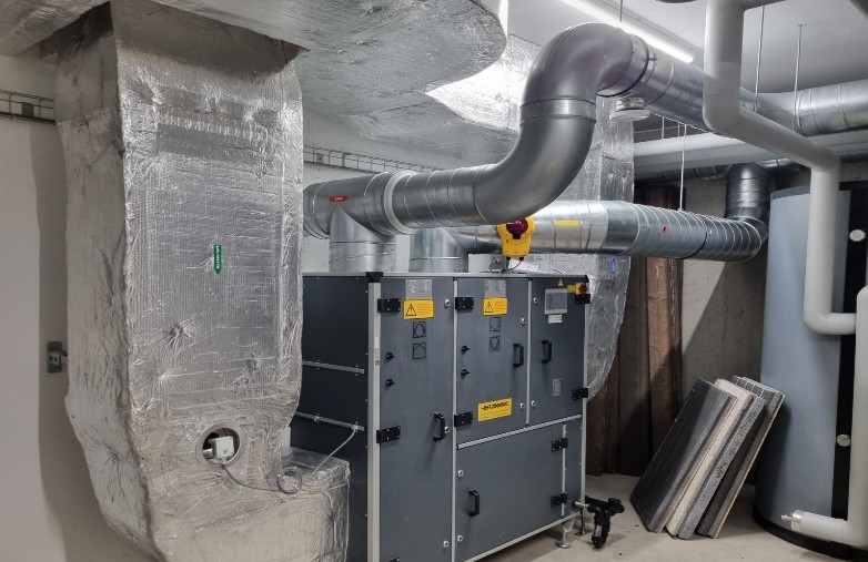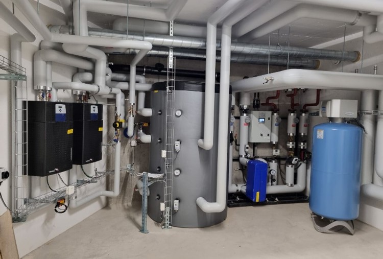 Je Hausteil eine Unterstation Heizung, Brauch-Warmwasserzeugung und Sanitärverteilbatterie. Mechanische Lüftung inkl. CO/NO-Überwachung der Einstellhalle. Mechanische Lüftung mit Teilentfeuchtung der allgemeinen Räume im Untergeschoss. Lüftung der gefangenen Räume in den Wohnungen mittels dezentralen Abluftventilatoren. Das Schmutzwasser wird an der Decke vom Untergeschoss gesammelt und hochliegend an die öffentliche Kanalisation übergeben. Das Regenwasser wird örtlich versickert. Einstellhalle ohne Anschluss an die öffentliche Kanalisation, Entwässerung der Einfahrtsrampe über Hebeanlagen.