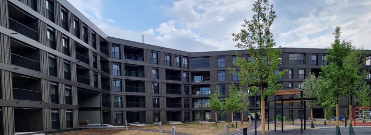 Wohnüberbauung mit total 74 Eigentumswohnungen, aufgeteilt in 2 Längsbauten (Haus A / Haus B) mit total 7 Treppenhäusern (7 Hausteile) sowie eines Pavillons. Die 2 Längsbauten sind über eine unterirdische Einstellhalle miteinander erschlossen.